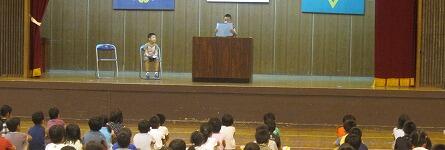 子どもたちは元気よく登校してきました。始業式では、2年生と4年生の児童が代表で2学期に