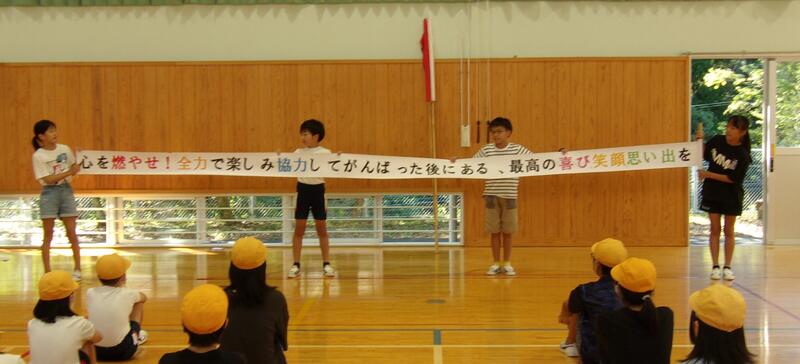 「心を燃やせ! 全力で楽しみ 協力して がんばった後にある 最高の 喜び 笑顔 思い出を」のスローガンのもと、運動会を実施しました。