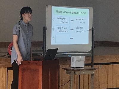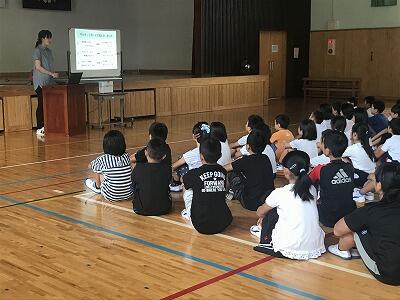 9月6日(金)9月のげんきもりもりタイムが行われました。今回のテーマは『睡眠』、8月に実施した元気っ子カードの結果をもとに、規則正しい生活と睡眠の大切さについてお話がありました。