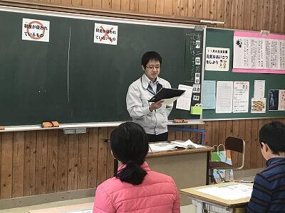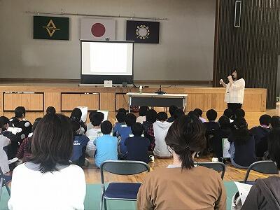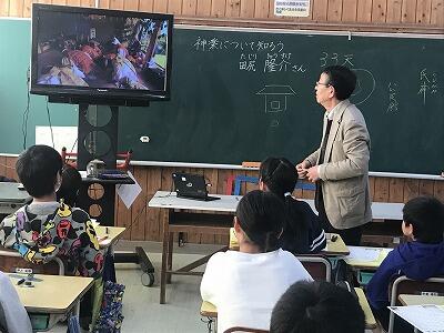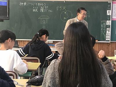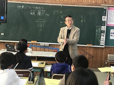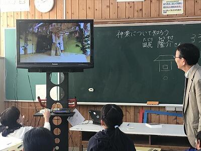 11月20日(水)今日は4年生で、地域の方に来ていただいて神楽について講話をしていただきました。氏神の話、神仏習合の話、神楽の舞の法則等についてわかりやすく説明していただきました。