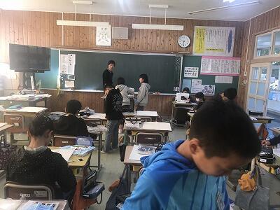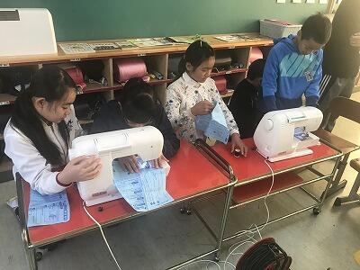 11月6日(水)今日は5年生の家庭科の授業がありました。今、ミシンを使ってバッグをつくっています。今日は糸なしのミシンで体験しました。