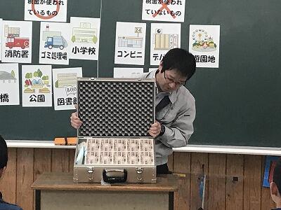 12月2日(月)今日は役場の税務課から講師を派遣していただき、6年生の租税教室が行われました。1億円のジェラルミンケースに興味津々の子ども達でした!