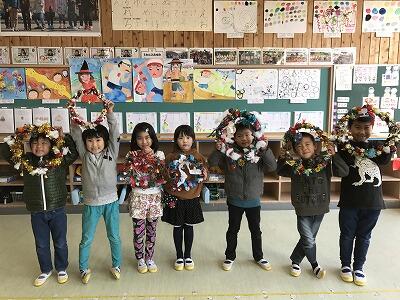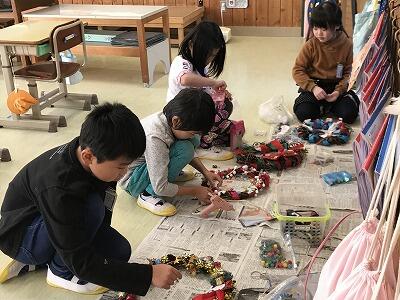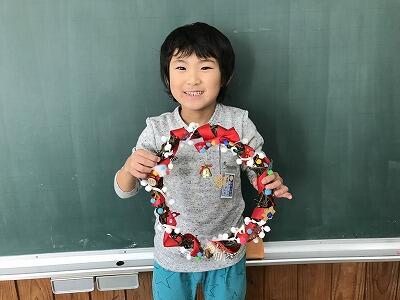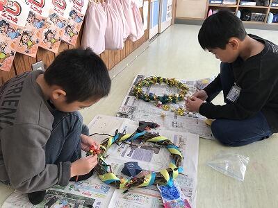 1年生が芋のつるで作ったリースに飾り付けを行いました!立派なリースができました!