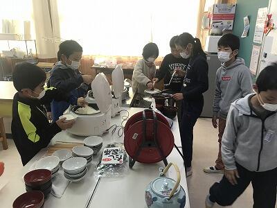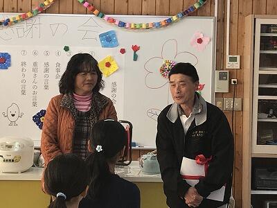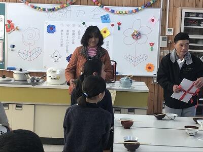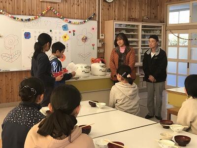 12月19日(木)今日は5年生が米作りでお世話になった佐藤ご夫妻に来ていただいて、感謝の会を開きました。お米のクイズや5年生が料理をしたお味噌汁と炊きたての新米をいただきました。