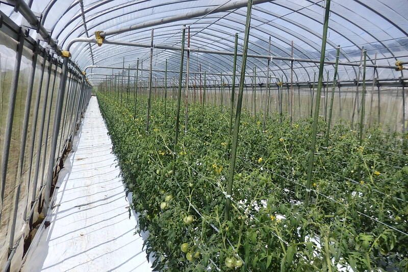 広くて大きなビニルハウスの中に、トマトが栽培されていました。