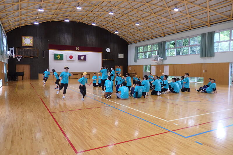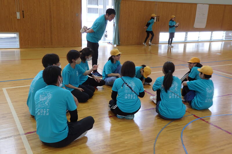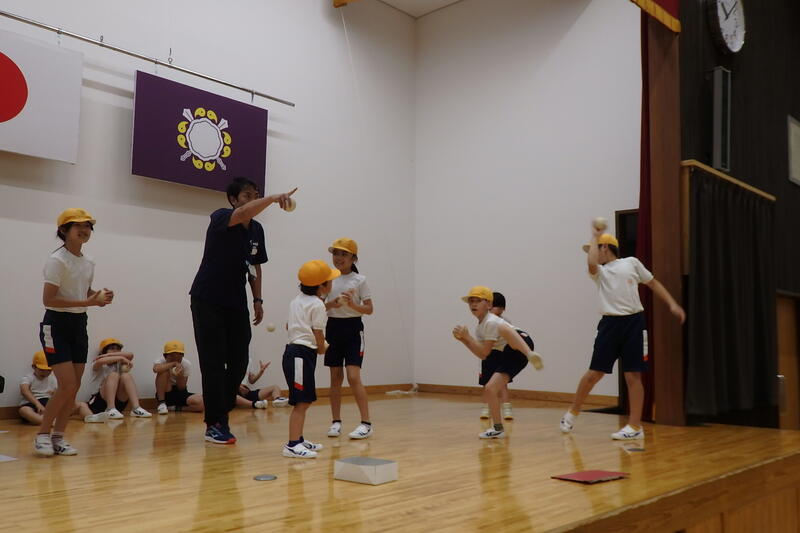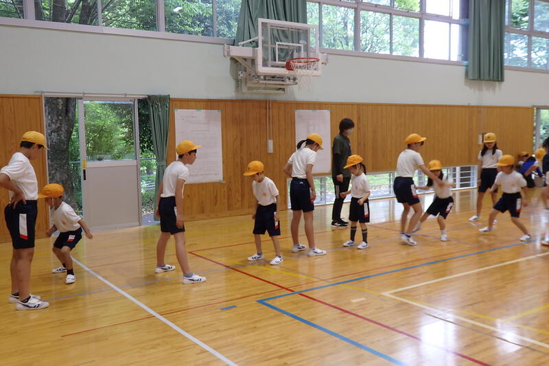 「反復横跳び」では、6年生が下級生と一緒にやり方を確認しました。