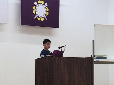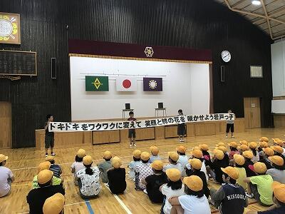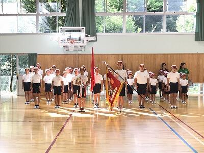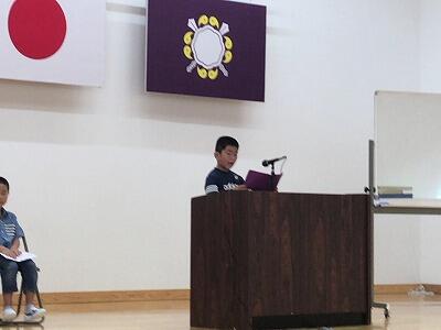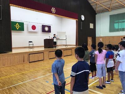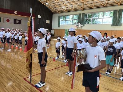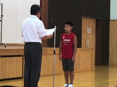 8月27日(月)第2学期の始業式が行われました。今日は転入生もあり、にぎやかなスタートになりました。作文発表では2名の児童が新学期の目標を述べてくれました。校長先生の話の後、校歌斉唱が行われ新学期がスタートしました。その後、剣道の表彰が行われました。いいスタートを切ることができました。