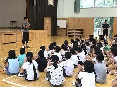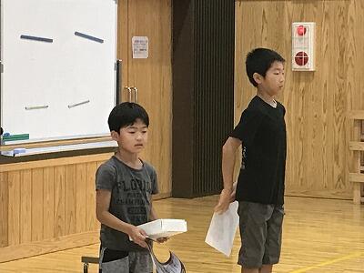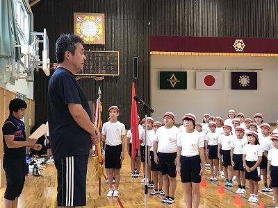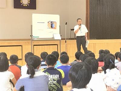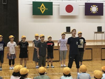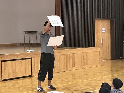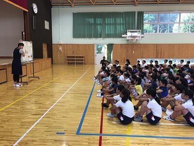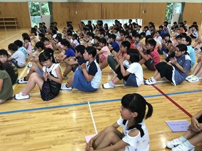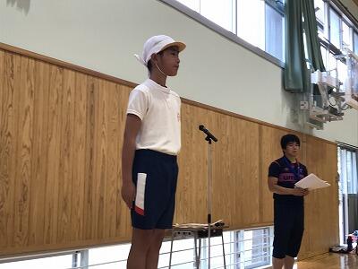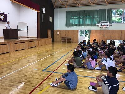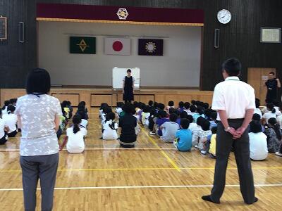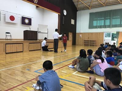 7月10日(火)今日は全校集会が行われました。校長先生からワールドカップで活躍したのは日本選手だけでなくゴミ拾いをした日本人サポーターやロッカールームをきれいにした控え選手がいたことを紹介され、チームワークの大切さを子どもたちに伝えてくださいました。その後に、門前町通りの通行について生徒指導主事から話がありました。最後に陸上と空手の表彰がありました。