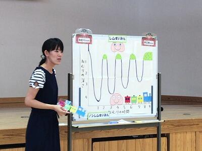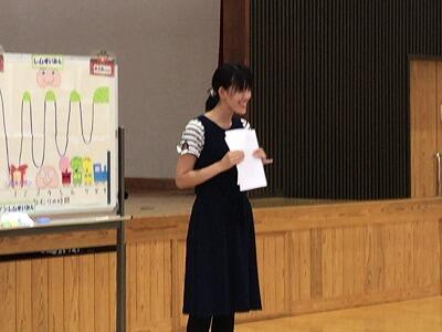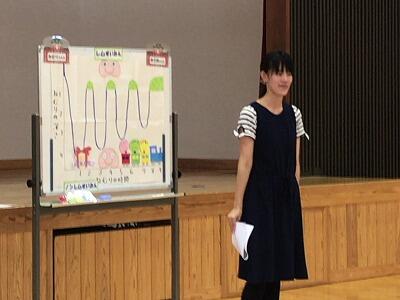 9月6日(木)今日は月に一度の元気もりもりタイムの日でした。睡眠の大切さについてお話がありました。レム睡眠とノンレム睡眠を手作りのボードとカードを使ってわかりやすく説明してもらいました。9月になり少し過ごしやすくなりました。よい睡眠をとって充実した学校生活をおくりましょう。
