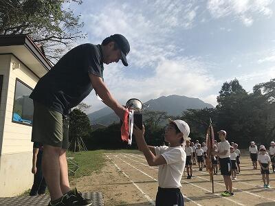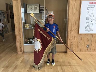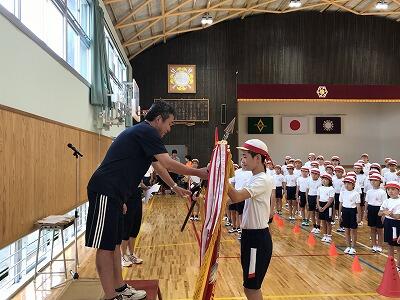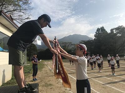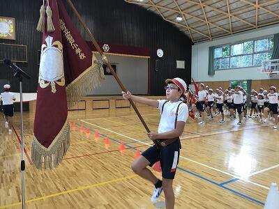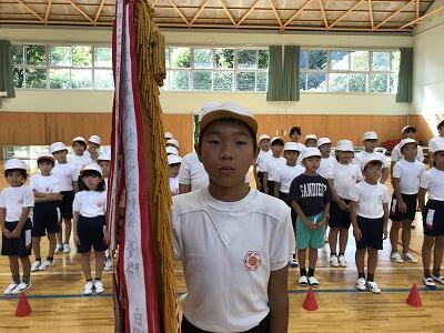 今年の運動会の校章旗をもつ児童が決まりました。運動会で立派な行進ができるように昼休みに練習が始まりました。