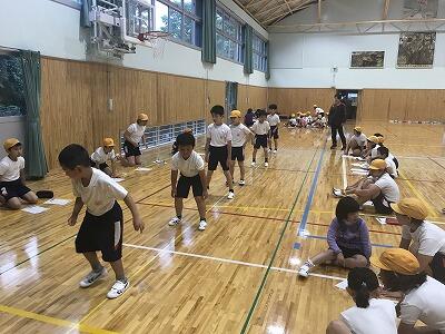 今日は、新体力テストのための全校体育が行われました。上学年と下学年がペアになり体力テストを行います。9日(水)が本番です。