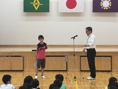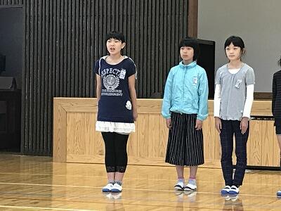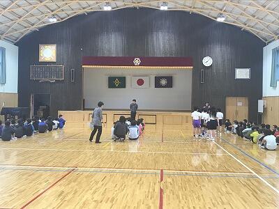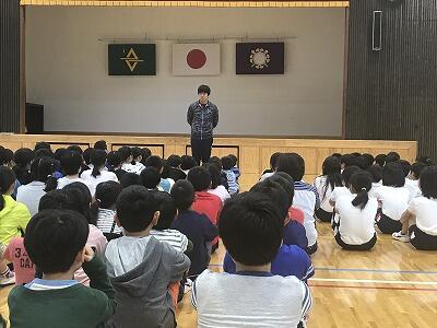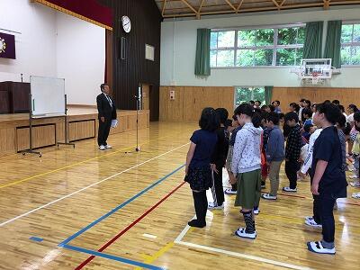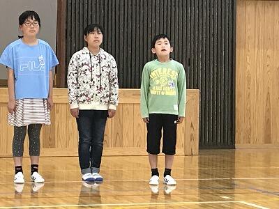 今日は、全校朝会が行われました。連休中の全校朝会となりましたが、子どもたちの元気な声に元気をもらいました。校長先生と「命を大切にする」「勉強を頑張る」「人に優しくする」という3つの約束をしました。そして、連休中の過ごし方についてお話がありました。楽しいゴールデンウィークにしましょう。