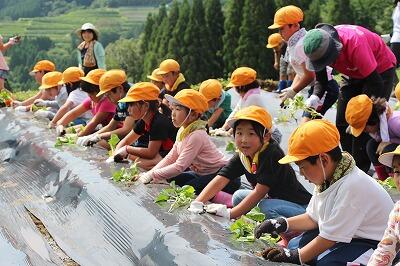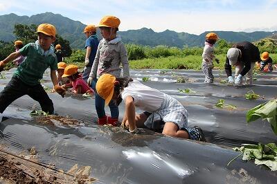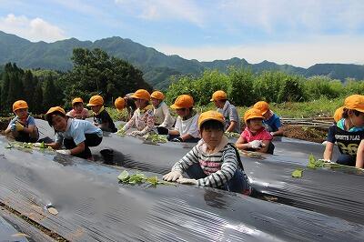 本日、1・2年生は芋の苗植え体験を行いました。天候に恵まれて豊かな体験を行うことができました。大きくなるのが楽しみです。