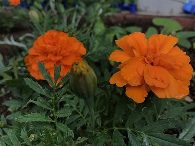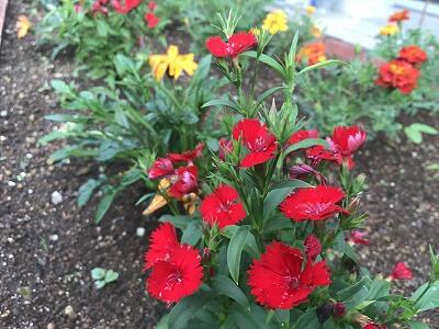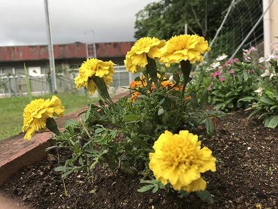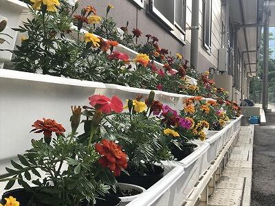 雨上がり、子どもたちが植えた花が、少しずつ大きく成長しています。夏頃には、花壇ぎっしりの花が咲くことでしょう。