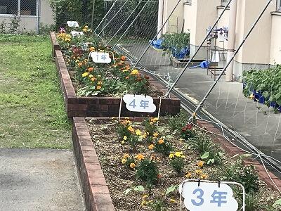 学年花壇のプレートの補修がおわりました。見えにくかった花壇のプレートがきれいになりました。花もすこやかに育っています。