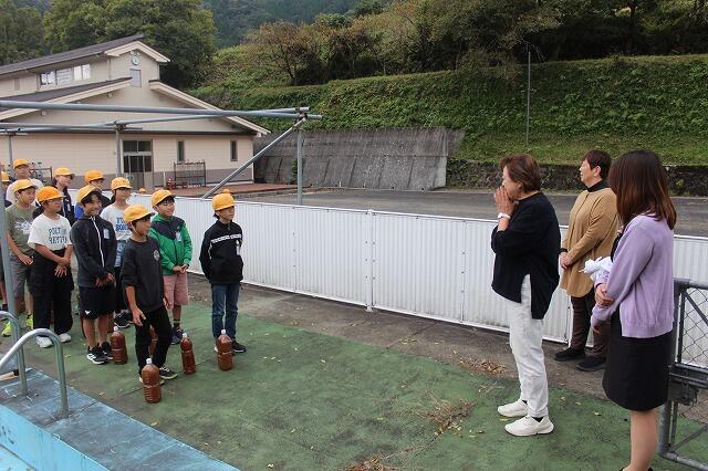 10月31日(木)に5年生がプールへEM菌を投入しました。EM菌は10月16日(水)に商工会女性部の方々に指導してもらい自分たちで作ったものです。このEM菌のはたらきでプールの水が分解され、プール清掃に役立つそうです。また、EM菌を花壇等にまくと植物の成長がよくなるそうです。次は、来年のプール清掃前にEM菌を投入する予定です。