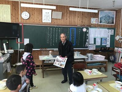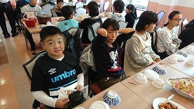 1・2年生が6月に植えたイモを使った給食が本日振る舞われました。イモ作りの先生である工藤さんに来校していただき1年生と一緒に会食をしていただきました。