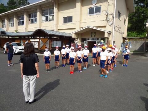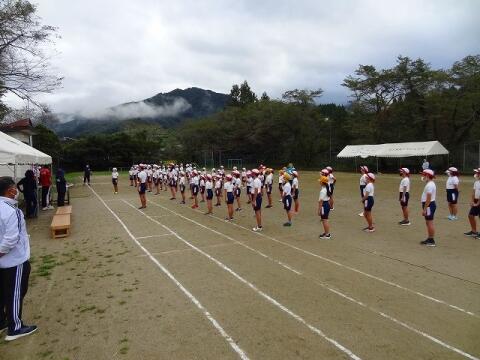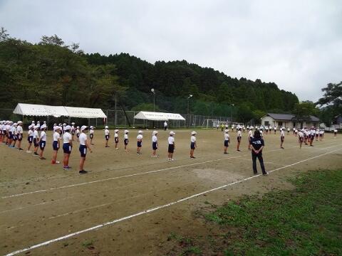 9月16日(木) 今日は運動会練習の第2回全校体育でした。昨夜まで雨が降っていましたが、なんとか運動場で実施することができました。開会式と閉会式、エールの交換の練習をしました。