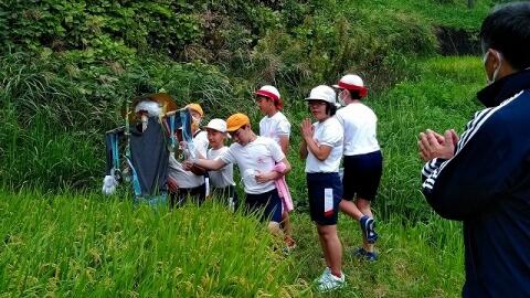 9月22日(水) 5年生は自分たちで作ったかかしを田んぼに立てに行きました。6月に苗を植えた稲には実が入り、稲穂を垂らしていました。作物を荒らす鳥などの害獣を追い払うため、5年生が協力して作った3体のかかしが、これからしっかりと田んぼのお米を見守ってくれれることでしょう。収穫が楽しみです。