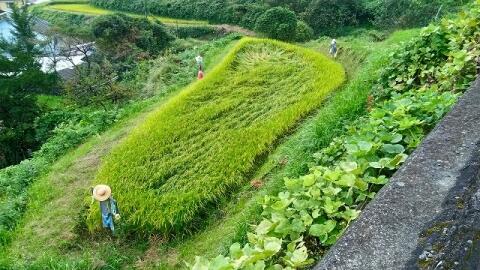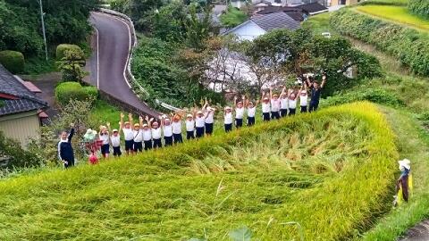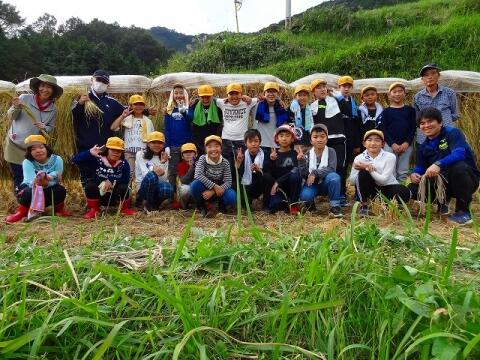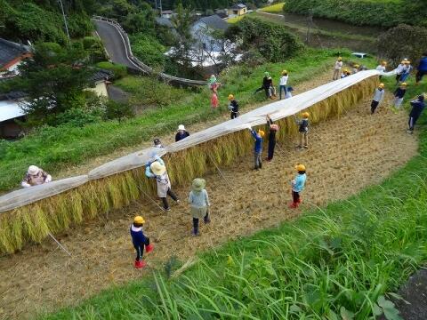 10月13日(水) 5・6校時に5年生が稲刈り体験をしました。穂が重たかったのか稲はほとんど倒れていましたが、鎌を使ってみんなで刈り取りました。刈り取った稲は束にしてひもで結び、それから竹竿にかけ、最後に上にビニールをかけました。2週間ほど干してから脱穀をします。