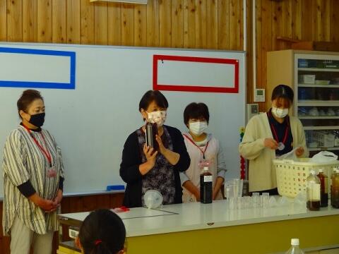 10月19日(火) 天岩戸商工会女性部と高千穂町商工会の方を講師に、5年生がEM菌について学び、その後、EM菌の培養の仕込み液を作りました。約2週間、こまめにガス抜きをしながら暖かい場所で培養し、できあがった培養液はプールに入れたり洗面所などの水回りに流すことにしています。岩戸小学校ではこの学習を何年も続けていて、きれいな学校からきれいな地域へ、そしてきれいな心へとつながっています。