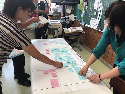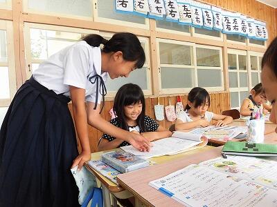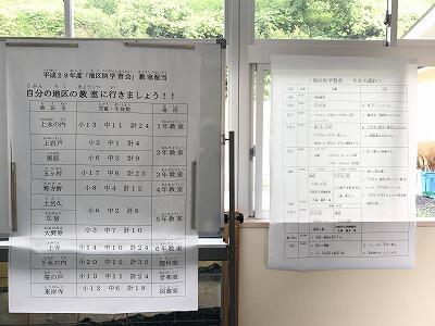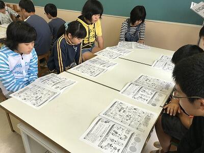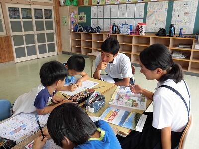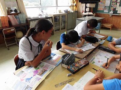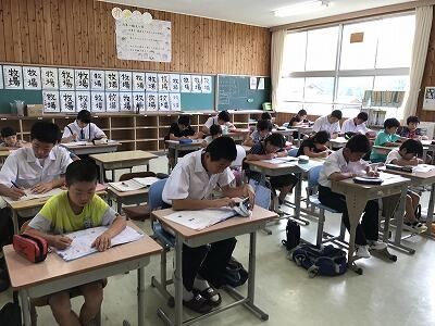 地区別学習会の学習①の様子です。中学生の先輩たちと同じ地区の小学生が合同で学習します。学習②は教え合い学習になります。
