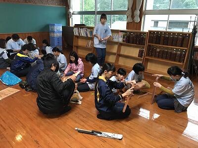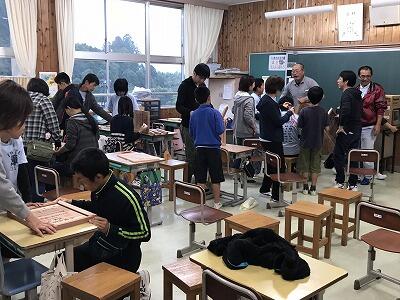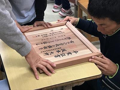 6年生は杉の木の卒業証書づくりを親子で行いました。教室と多目的ホールに分かれて作業を行いました。枠をはめていく作業に苦戦する場面もありましたが、立派な証書ができました。