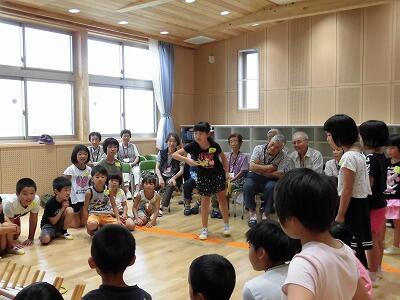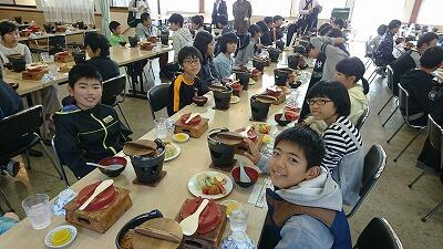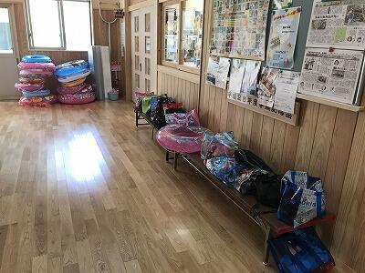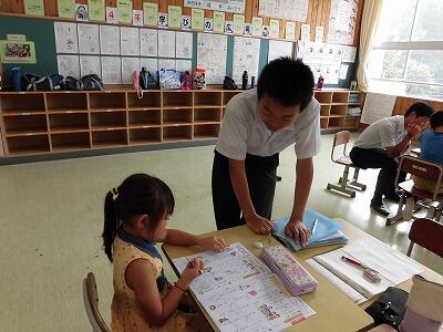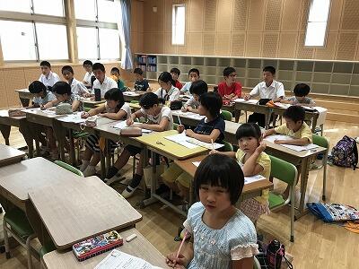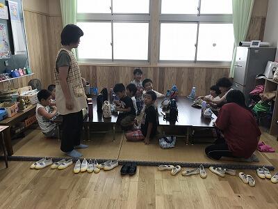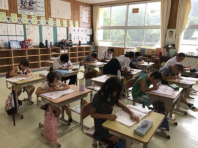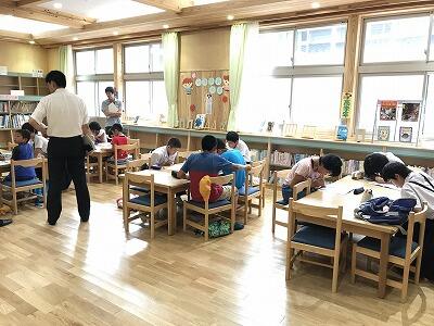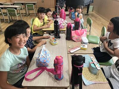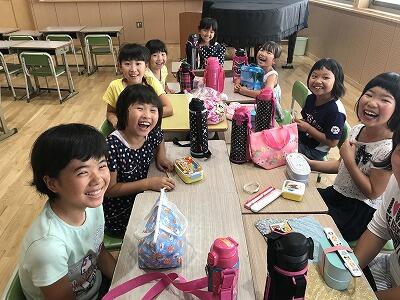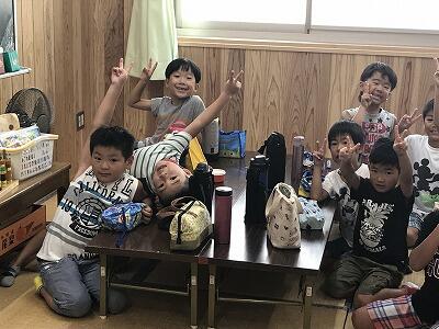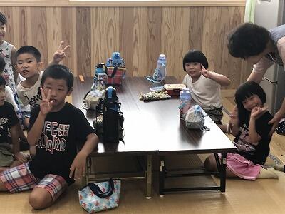 岩戸小学校の児童クラブも夏休みの活動を行っています。夏休みの宿題も順調に進んでいます。真っ黒に日焼けした元気な子どもたちです。お昼は、みんなで会食です。