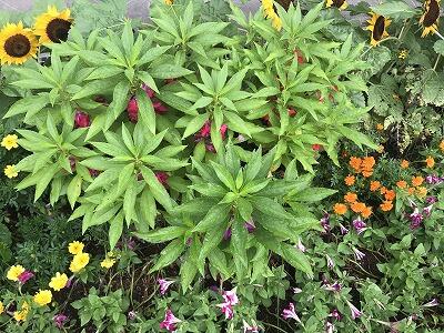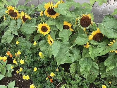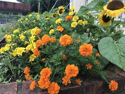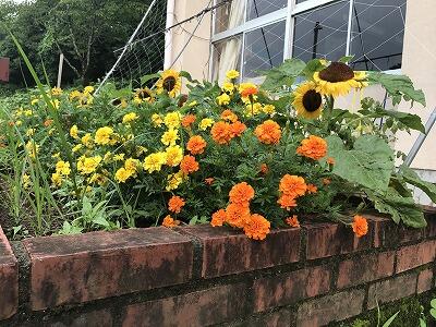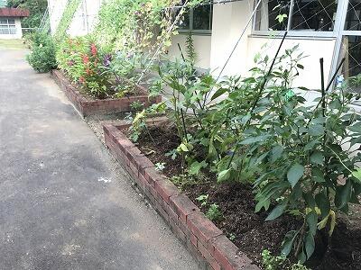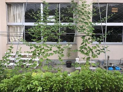 夏休みに入り、暑い日が続いていますが、岩戸小学校の花壇の花は元気に成長を続けています。グリーンカーテンも日に日に大きくなっています。