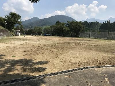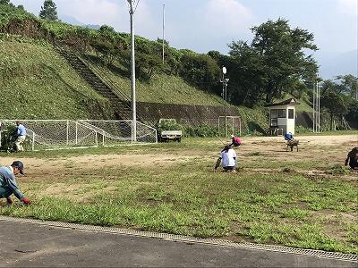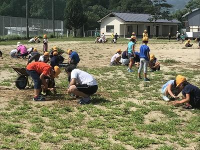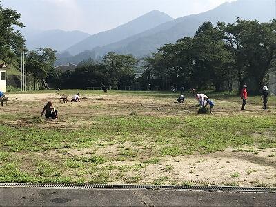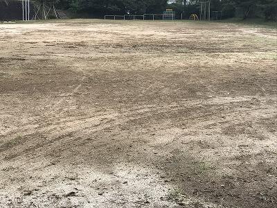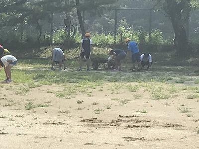 8月20日(日)にPTA環境整備作業できれいになった運動場を運動会用に整備を行いました。グレーチング(側溝のふた)を車で引いて整備を行いました。
