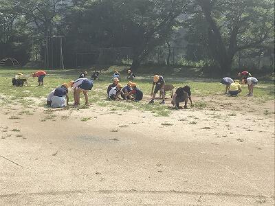2学期が始まって2日目、登校班による朝の草抜き活動が始まっています。岩戸小学校の運動会をみんなの手で作り上げるための活動です。運動場がどんどんきれいになっていきます。『ちりも積もれば、山となる』です。