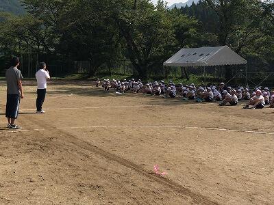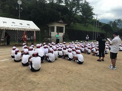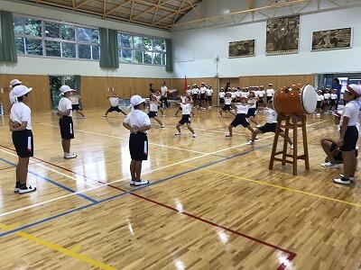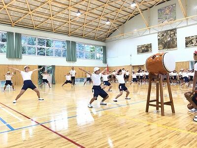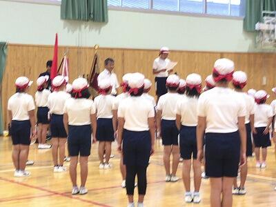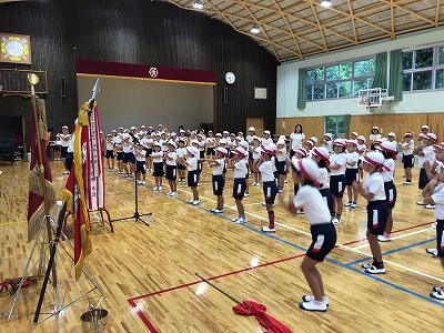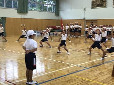 今日の全体練習は雨天のため体育館練習となりました。全体練習も3回目とあってスムーズに行動することが増えてきました。閉会式、エールの交換、応援の練習が行われました。今日の校長先生の評価は80点。確実にステップアップしている様子が見えました。