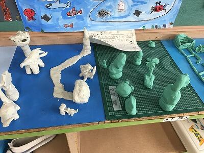 1年生が図工の時間につくりました。学級の後ろの棚がにぎやかになりました。今にも動き出しそうです。