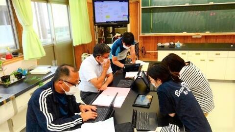 7月7日(水) 放課後の主題研究で、教職員もタブレットの操作やソフトの使い方に慣れるというねらいも含めて、児童用タブレットを使って研修しました。