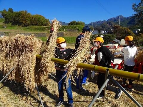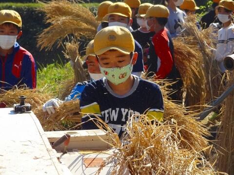 11月12日(木) 5・6校時に最後のお米体験学習である「脱穀」を体験しました。先日刈って天日干しにしていた稲をハーベスターにかけて、籾(モミ)を収穫しました。佐藤重昭様には田植えから稲刈り、脱穀と大変お世話になりました。また、これまでご協力いただいた保護者の方にも感謝いたします。