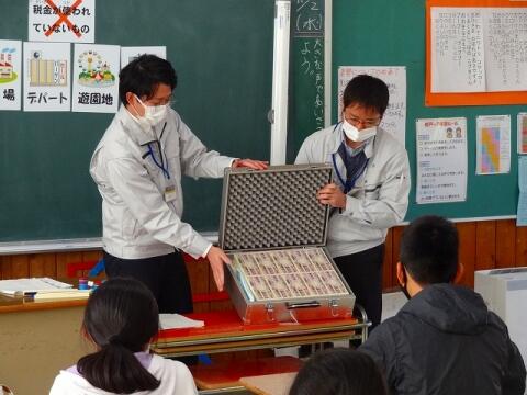 12月2日(水) 高千穂町役場税務課の興梠様、江藤様を講師として、6年生は税金について学習しました。DVDやお金のレプリカ等を用いたお話やクイズで、児童は税について楽しく学ぶことができました。