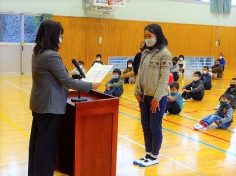 1月18日(月) 全校朝会を行い、初めに表彰を行いました。本校6年生の児童が日本郵便株式会社主催の「はがき作文小学校6年生の部」で日本郵便賞をいただきました。次に、校長が「10年先を見て行動する」ことの大切さについて話しました。6年生の10年後は二十歳を過ぎています。10年先の自分はどうなっていたいか考えることで、今、何をなすべきかが見えてくることでしょう。