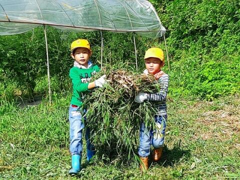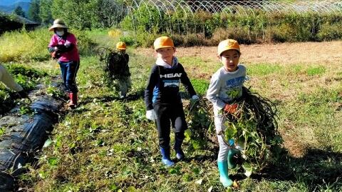 ◎ 切り取られたツルを子どもたちが運びます。