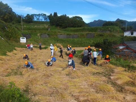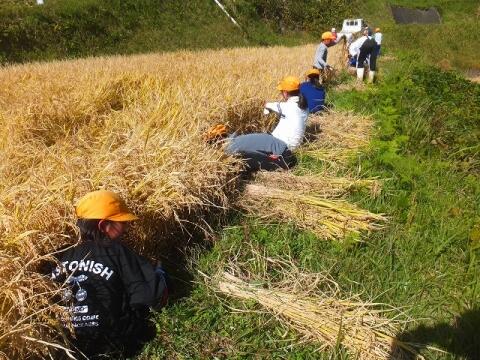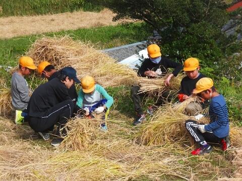 10月26日(月) 5・6校時に「稲刈り」を体験しました。慣れない釜を持っての作業に苦労する児童もいましたが、何とか稲を刈り取って麻ひもで束ね、竹竿にかけていきました。大変な作業でしたが、最後までやり遂げることができました。