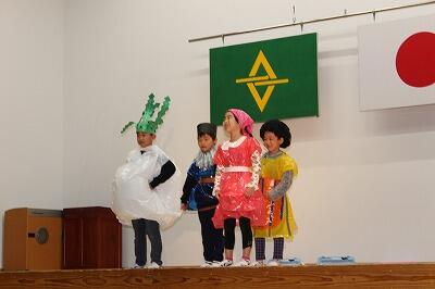 4年生はこれまで総合的な学習の時間で調べてきた岩戸の神話や伝承を劇にしました。「新・天岩戸伝説」を発表しました。「えりもの」も手作りでステージを飾りました。