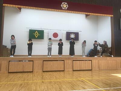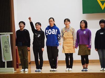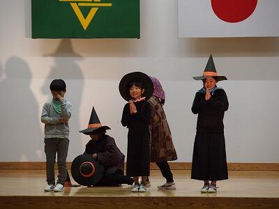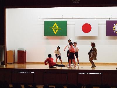 4年生はこれまで総合的な学習の時間で調べてきた岩戸の神話や伝承を劇にしました。「新・天岩戸伝説」を発表しました。「えりもの」も手作りでステージを飾りました。