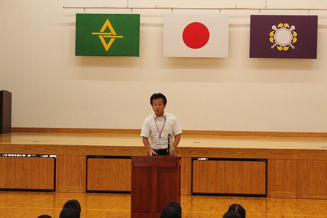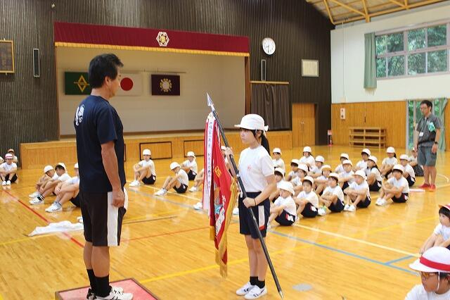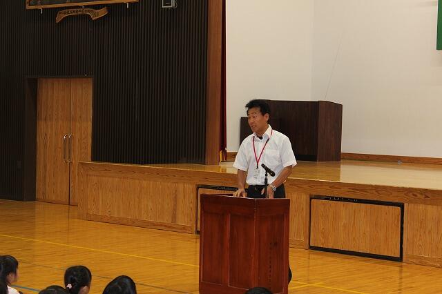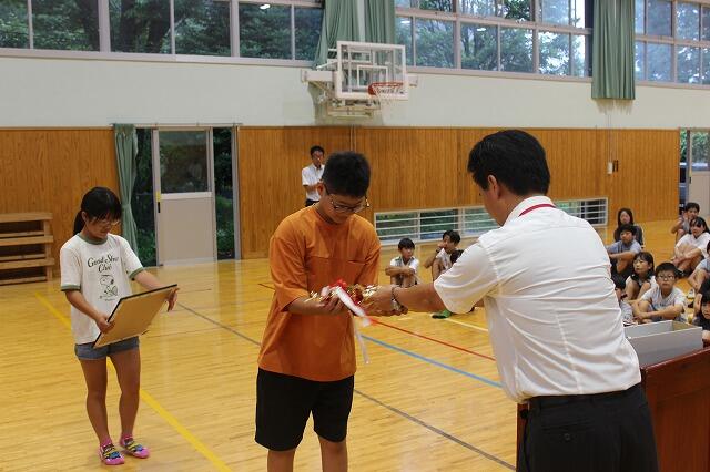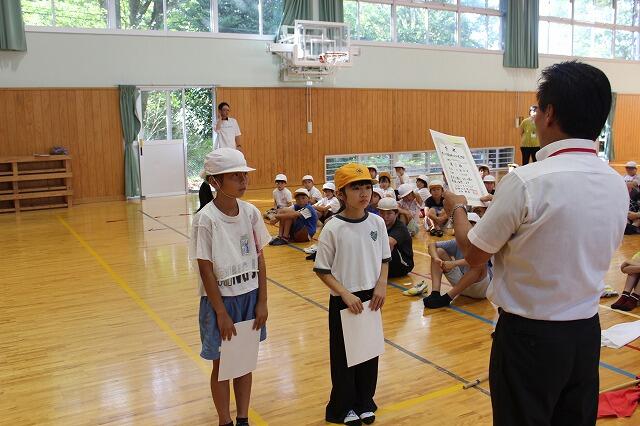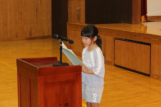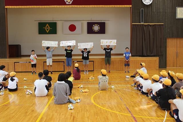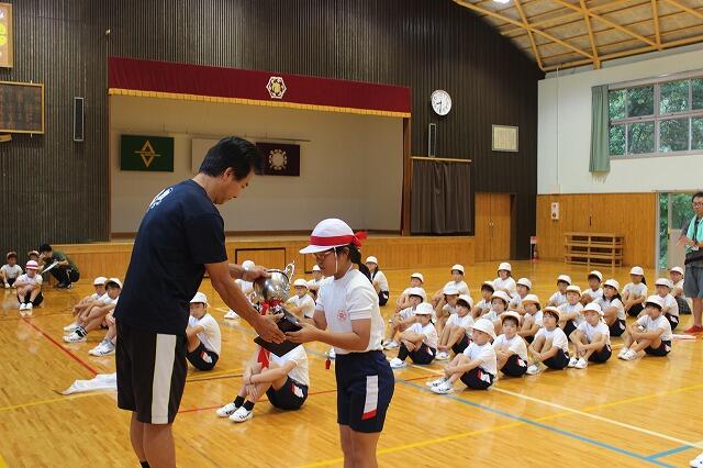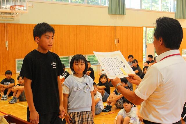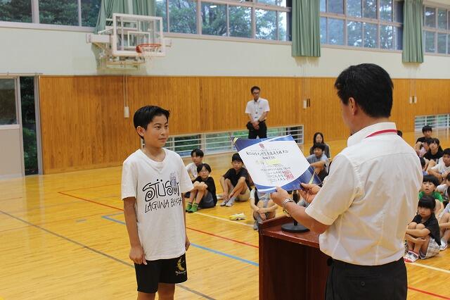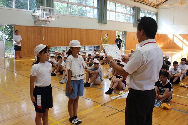 7月18日(金)に1学期の終業式を実施しました。まず、2年生の工藤涼花さんが1学期の反省を発表しました。その後に古賀校長先生から1学期の始業式で全児童に話した「自分も他の人(友達、家族、先生)も大切にしましょう。」が守れたのかの確認がありました。そして、夏休み中には、必ず自分で命を守る、お家の人の言うことをよく聞き実行して、2学期元気に会いましょうという話がありました。終業式の後には表彰があり、まず、ファイティングオープントーナメント第20回全九州空手道選手権大会初級クラスで優勝した6年の佐藤優心さん、次に第61回宮崎県スポーツ少年団中央大会ソフトボール競技で1位に輝いたスピリッツソフトボールクラブスポーツ少年団、表彰おめでとうございました。