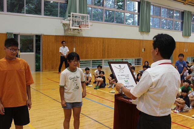 結団式の後に、表彰を行いました。まず、第26回高千穂ナイター陸上大会の小学低学年女子800mの部で3年の工藤日宝さんが1位、同じく3年の佐藤百華さんが3位に入賞しました。小学高学年女子800mの部で5年の佐藤望愛さんが2位に入賞しました。次に、西臼杵郡サイエンスコンクールで5年の甲斐陽愛さんが最優秀賞、4年の中西泉月さんと3年の工藤日宝さんが優秀賞に輝きました。表彰された児童のみなさん、おめでとうございます。