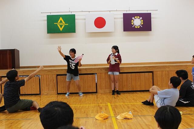 9月12日(金)に結団式を行いました。最初にスローガンの発表があり、今年度は「岩戸っ子 勝っても負けても 金メダル」に決定しました。その後、事前に組み分けしていたA団とB団が玉入れをして、振ったら赤白の色が出るペットボトルを選ぶ順番を決め、玉入れに勝ったA団からペットボトルを選びました。その結果、A団が白団、B団が赤団に決まりました。これから10月19日(日)の運動会当日まで、白団団長の工藤瑞季さん、赤団団長の竹尾心希さんを中心に盛り上げていってほしいです。