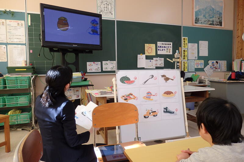 タブレット端末から出される生成AIの発音を視聴して、「す」の発音ビンゴゲームをしました。