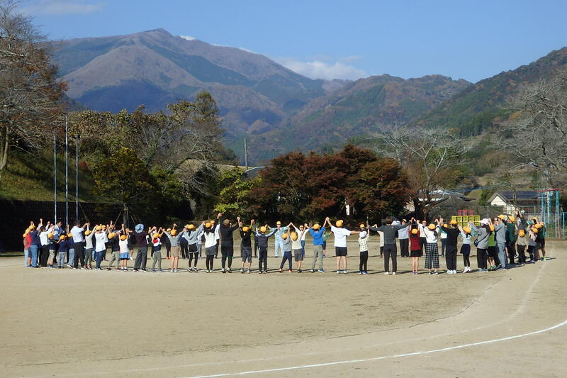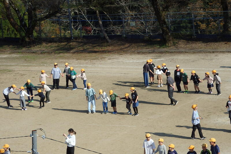 全校児童が一つの輪になり、指示とは逆の行動(「前」と言われたら「後ろ」に移動など)をする活動をしました。