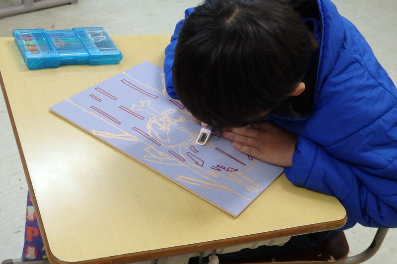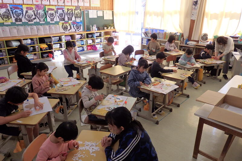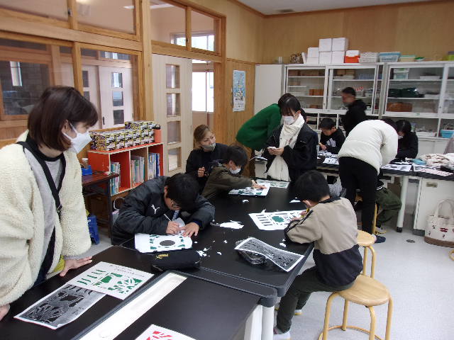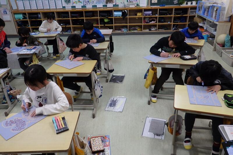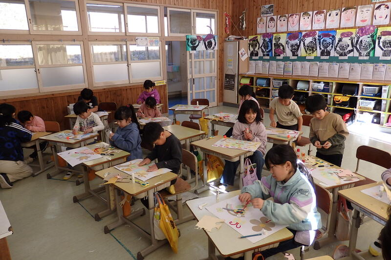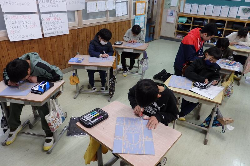 3年生と4年生は、夜神楽で奉仕者(ほしゃどん)が舞う舞台・神庭(こうにわ)の四方に飾られる切り絵のような「彫り物(えりもの)」づくりを行いました。