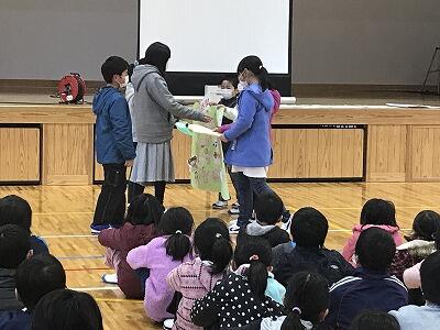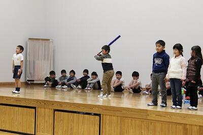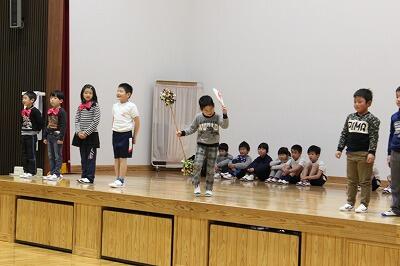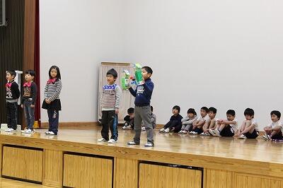 1年生22名による劇が熱演されました。全員が登場して、自分の得意なところを元気よく表現する姿に引き込まれる劇でした。