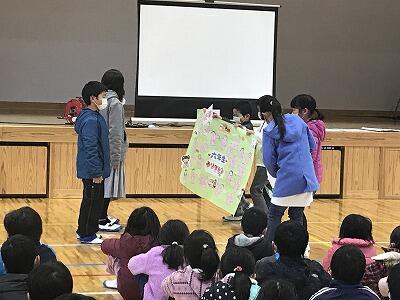 今日は、給食感謝集会が行われました。健康委員会の進行で、岩戸小学校の給食がどのようにして作られているのかをクイズ形式で説明してくれました。