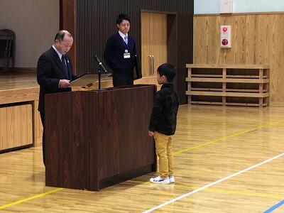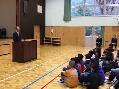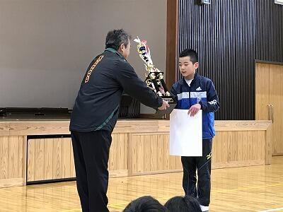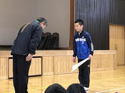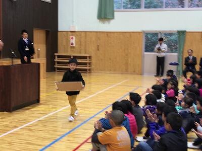 今日は12月の全校朝会が行われました。校長先生から残り2週間『心』を整えて、最後まで目標達成を目指そうというお話がありました。その後に表彰がありました。